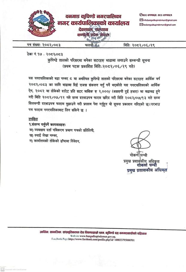 » कुपिण्डे तालको परिसरमा बनेका सटरहरु भाडामा लगाउने सम्बन्धी सूचना।