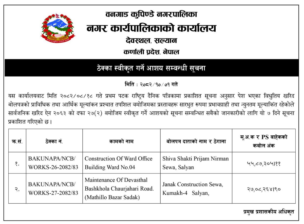 ठेक्का स्वीकृत गर्ने आशय सम्बन्धी सूचना।