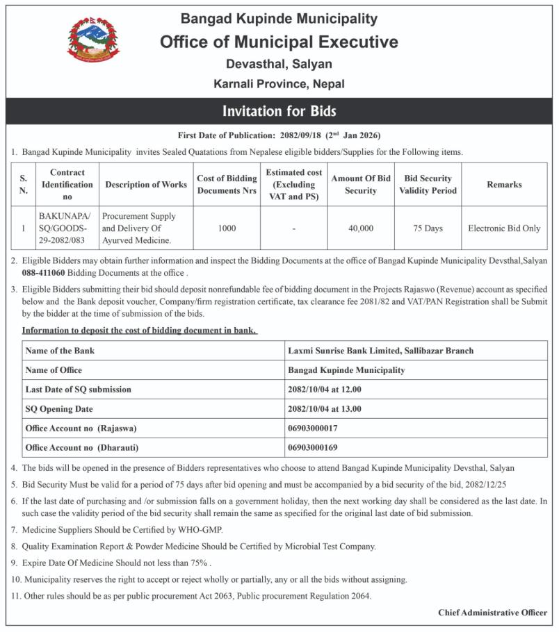 नगर अस्पताल रअन्य स्वास्थ्य संस्थाको लागि आवश्यक मेडिकल उपकरण तथा सामाग्री खरिद सम्बन्धी ठेक्का आव्हानको सूचना।