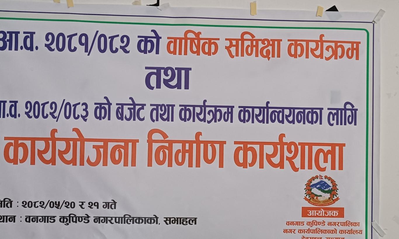 यस वनगाड कुपिण्डे नगरपालिकाको आ.व. २०८१/८२ को वार्षिक प्रगति समिक्षा तथा आ.व. २०८२/८३ को बजेट तथा कार्यक्रम कार्यन्वयनका लागि कार्ययोजना कार्यशाला आज मिति २०८२/०५/२० गते सम्पन्न