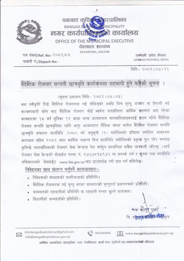 वैदेशिक रोजगार सन्तती छात्रवृत्ति कार्यक्रममा सहभागी सम्बन्धी सूचना।