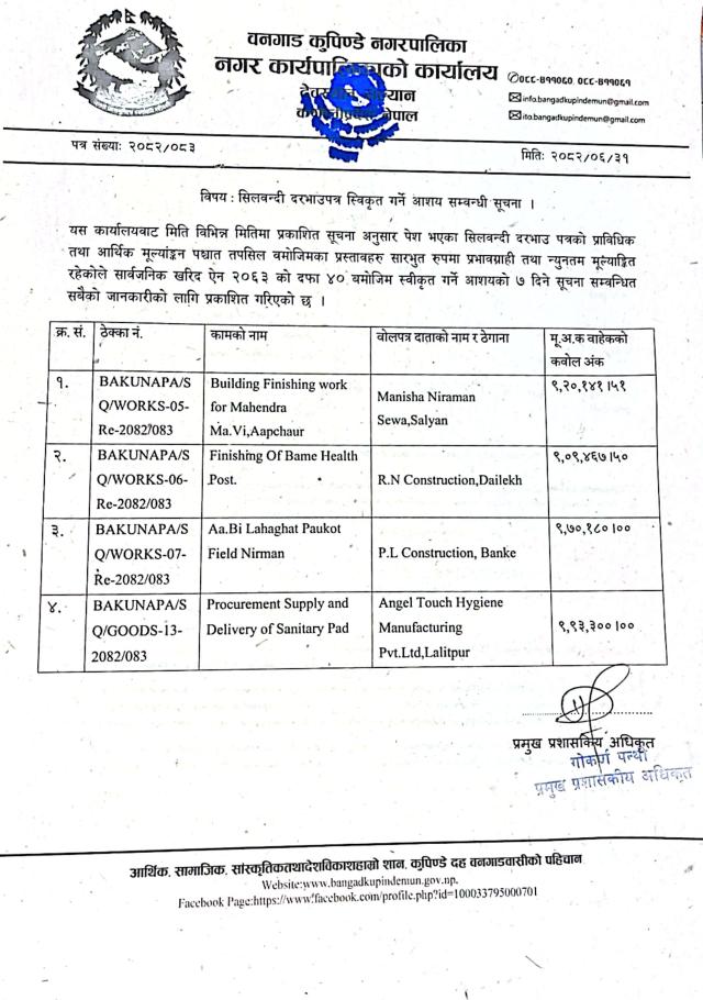 ठेक्का स्वीकृत गर्ने आशय सम्बन्धी सूचना।