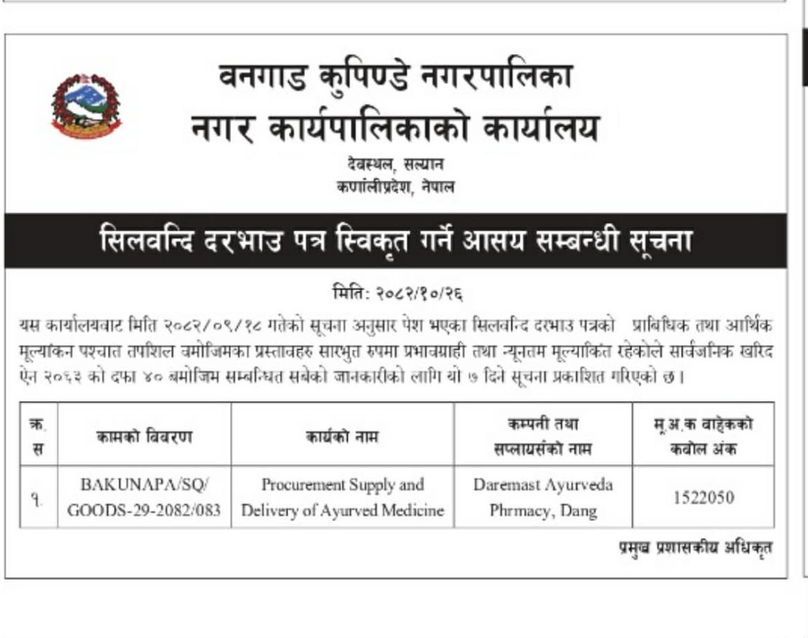 सिलबन्दी दरभाउ पत्र स्वीकृति गर्ने आशय सम्बन्धी सूचना।