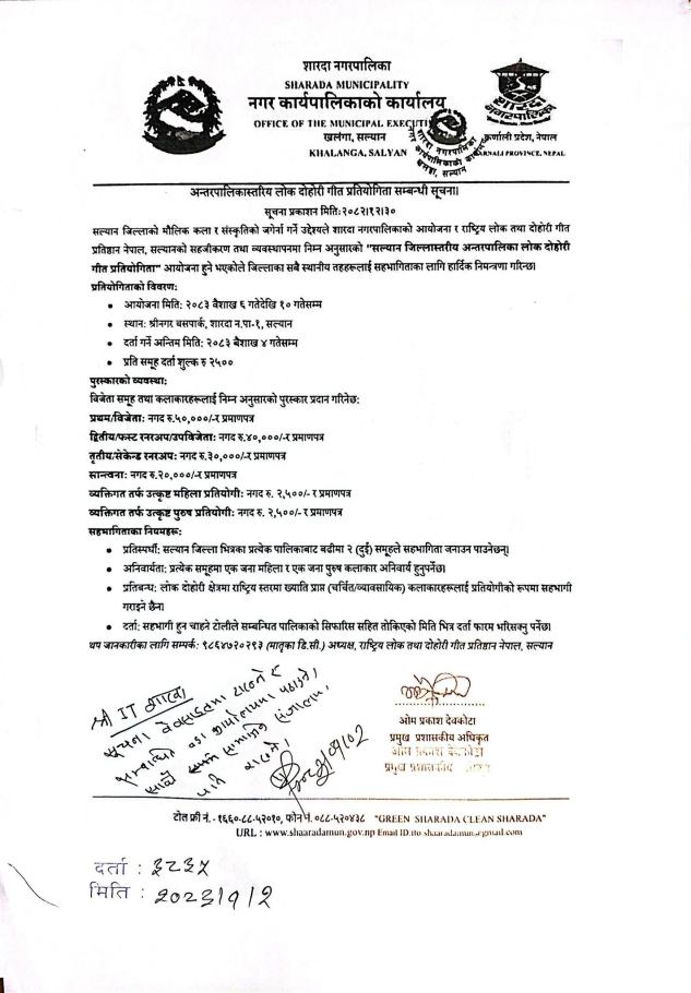 अन्तरपालिका स्तरीय लोक दोहोरी गीत प्रतियोगिता सम्बन्धी सूचना।