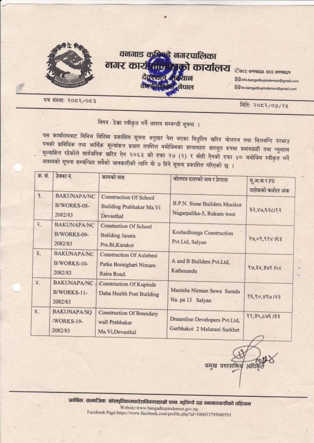ठेक्का स्वीकृत गर्ने आशय सम्बन्धी सूचना।